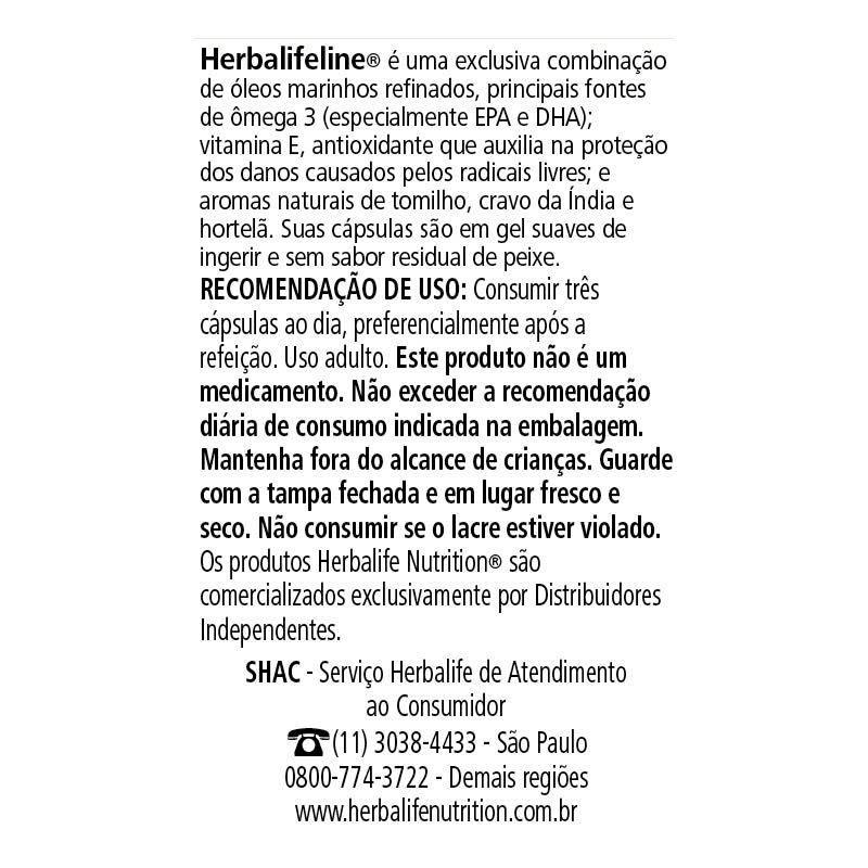 O Herbalifeline* é um alimento funcional composto por uma combinação de óleos de peixe de origem marinha (fonte de ômega 3)e vitamina E. O ômega-3 é um ácido graxoessencial não produzido pelo corpo e deve ser obtido pela alimentação. Seu consumo adequado, aliado a uma alimentação balanceada, pode trazer benefícios como auxiliar na manutenção de níveis saudáveis de triglicerídeos.