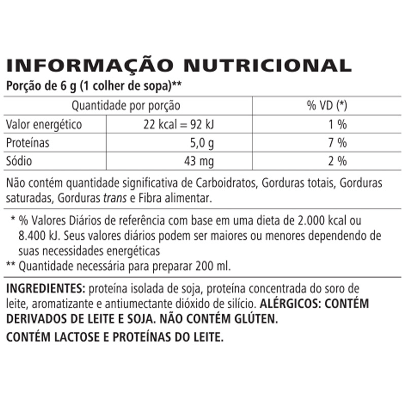 Combinação de proteína isolada de soja e concentrada do soro do leite, fornecendo 5g de proteína de alto valor biológico, por porção;