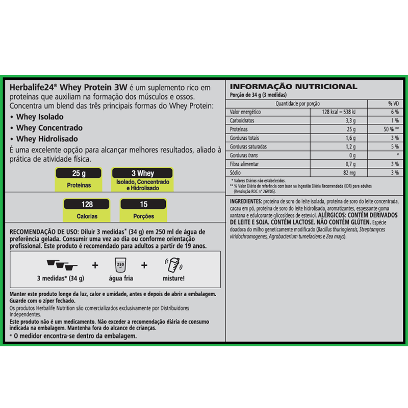 1Suplemento alimentar de proteínas em pó. ALÉRGICOS: CONTÉM DERIVADOS DE LEITE E DE SOJA. CONTÉM LACTOSE. NÃO CONTÉM GLÚTEN. Os produtos Herbalife podem ser usados em receitas; porém, somente quando preparados conforme instruções do rótulo, entregam todos os benefícios nutricionais, de qualidade e segurança. Leia atentamente o rótulo antes de consumi-los.